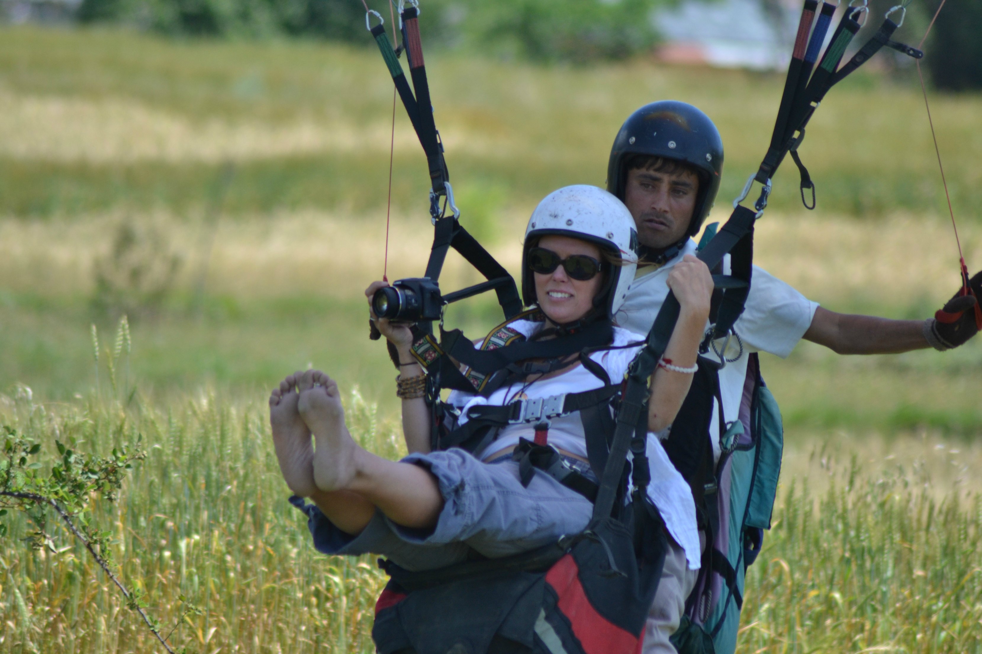 As they’re getting me all strapped up and ready to go, they instruct me to take off my shoes – I wore flip flops… Stupid Eryn, stupid, stupid!!! Grrr… I’m remembering the last time I was strapped to a parachute when I went sky diving, and then also, I wore inappropriate shoes and had to fly/land shoeless… Not very smart are you Eryn?? Really two times strapped to a parachute and no shoes?? Grrrr….
