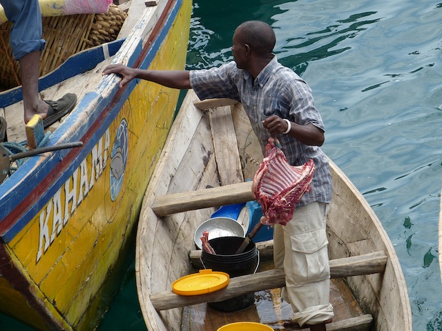 The main entertainment on the ship was when we stopped in the lakeshore towns to pick up more cargo and passengers. The Liemba would blow her horn to signal to the villages that we were approaching. Dozens of people would jump in their canoes, rowboats and motorized vessels to come meet the ship. It seemed to be advantageous to be the first boat to the ship to take disembarking passengers and their cargo to the shore. The first boat gets the most people, i.e, the most money. As the first boat would arrive, men would jump from their small boat and scale the side of the Liemba to grab bags and suitcases of disembarking passengers thereby securing a ride on their boat. Most of the time it was a fairly peaceful yet chaotic endeavor, but a few times there was some aggressive behavior to fight to get passengers on certain boats.