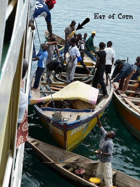 Locals come to sell to the passengers on the Liemba. This guy is throwing an ear of corn to someone above.